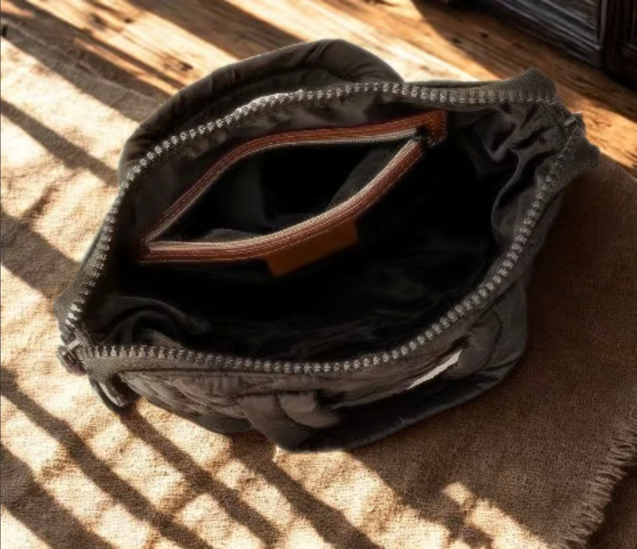 • Secure zip-top closure with lined interior