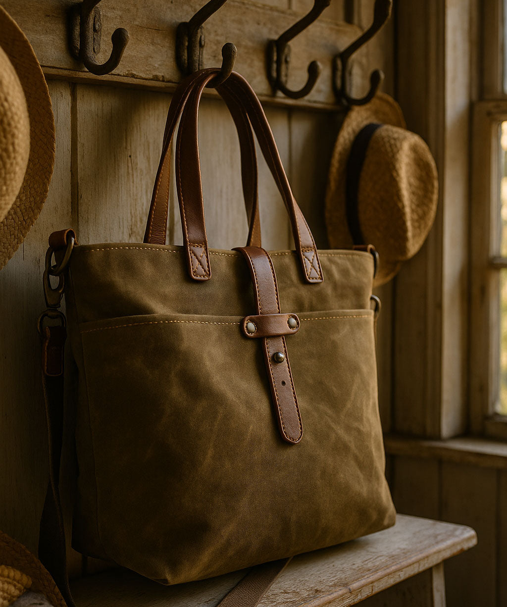 The Fernhollow Pasture Tote blends durable materials with classic farmhouse charm. Crafted from waterproof waxed canvas and trimmed with Crazy Horse leather, it’s a carryall that handles everything from farmer’s markets to overnight escapes—with quiet, olive-toned confidence.